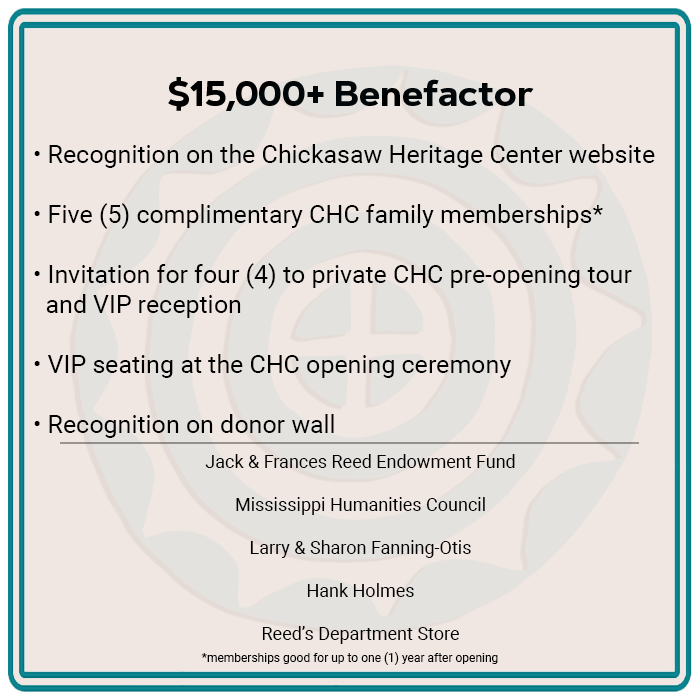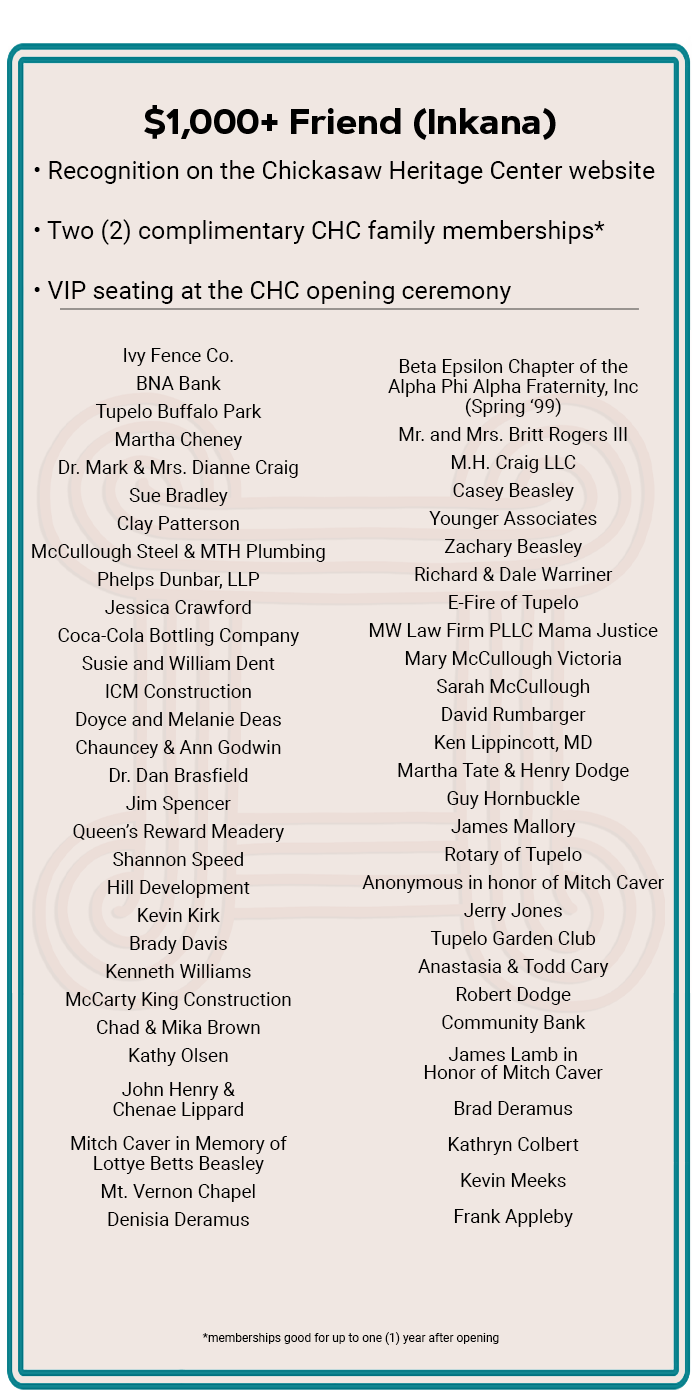 Become a Chickasaw Heritage Center (CHC) Charter Member and get a Complimentary Annual Membership in the Chickasaw Inkana Foundation (CIF)! While the CHC takes shape, the CIF continues its mission to preserve, protect and interpret Chickasaw history and culture in the historic Chickasaw Homeland. For a limited time, make history with us.